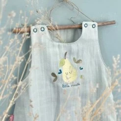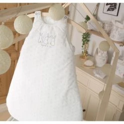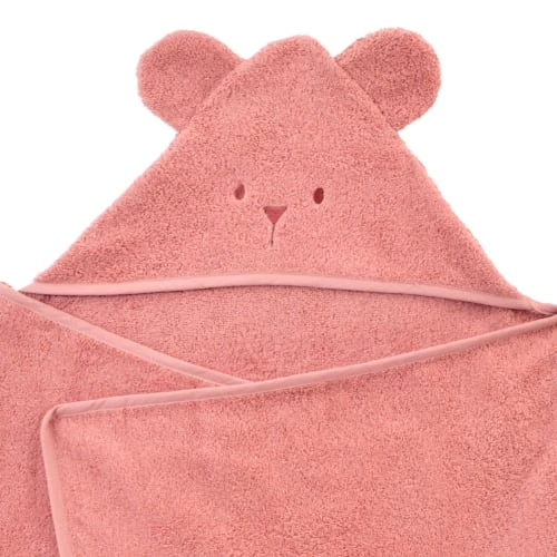 Forme rectangulaire pour bien envelopper bébé et capuche au milieu décorée d’oreilles et brodée d’un visage ourson.