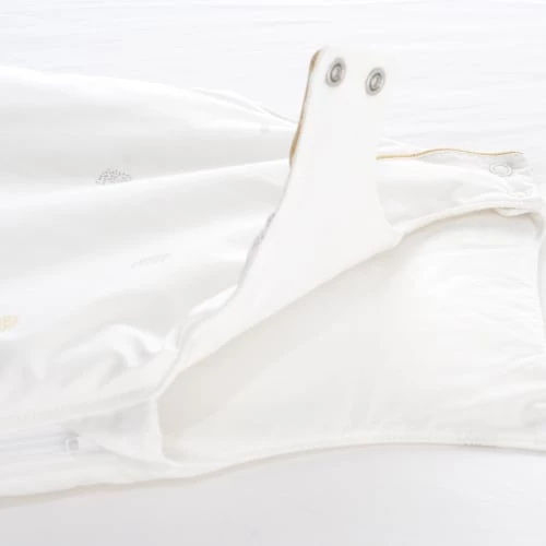 Avertissement de sécurité : Ne pas utiliser si la tête de l’enfant peut passer par l’encolure une fois celle-ci attachée. Veiller à ce que l’encolure et les emmanchures soient correctement attachées. Ne pas utiliser si l’enfant peut grimper et sortir du lit à nacelle. Ne pas utiliser en combinaison avec une couette pour lit à nacelle ou une couverture. Tenir compte de la température de la pièce et des vêtements de nuit portés par l’enfant. Un excès de chaleur peut mettre la vie de votre enfant en danger.