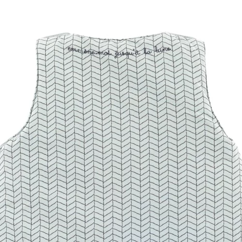 Avertissement de sécurité : Ne pas utiliser si la tête de l’enfant peut passer par l’encolure une fois celle-ci attachée. Veiller à ce que l’encolure et les emmanchures soient correctement attachées. Ne pas utiliser si l’enfant peut grimper et sortir du lit à nacelle. Ne pas utiliser en combinaison avec une couette pour lit à nacelle ou une couverture. Tenir compte de la température de la pièce et des vêtements de nuit portés par l’enfant. Un excès de chaleur peut mettre la vie de votre enfant en danger.