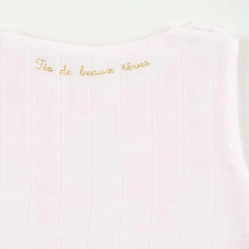 Dessus en lange rose pâle brodée d’un visage de cygne, doublure en lange uni rose pâle. Broderie dorée au dos dans l’encolure.