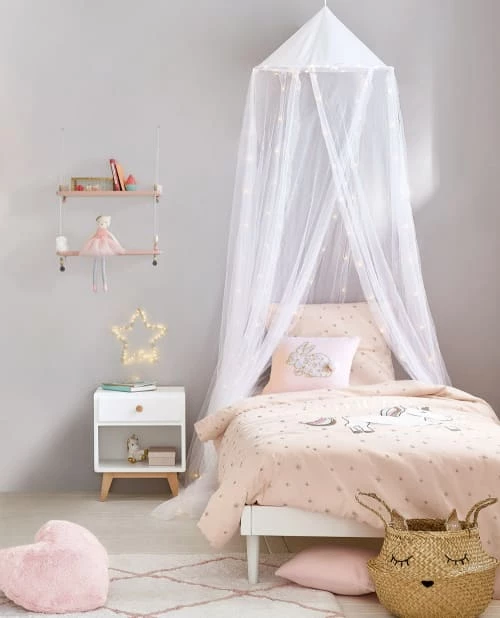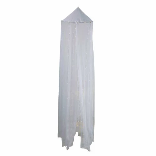 Succombez au ciel de lit lumineux écru à LED, qui transportera votre petit cœur vers des nuits douces et des rêves féeriques. Une jolie teinte blanche, un voile légèrement transparent, une pluie de leds lumineuses… Il y a de quoi succomber ! Fixé au-dessus du lit, ce ciel de lit lumineux offrira un joli tomber et surtout un espace propice à la rêverie. Vous pourrez aussi l’installer dans un coin de la chambre, avec un matelas gaddiposh, des coussins et quelques jouets. Votre petite frimousse se sentira comme dans une cabane et pourra y jouer pendant des heures. Pour allumer et éteindre les leds, rien de plus simple. Il suffira à votre enfant d’appuyer sur le bouton du secteur.